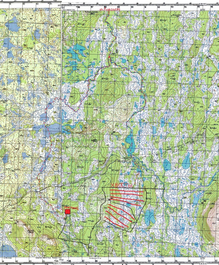 Красным обозначена зона отходов и движение воды до оз. Ловозеро