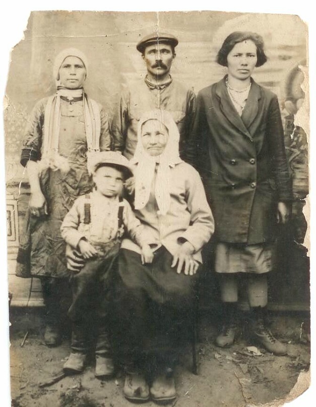 Ксения Ильинична Дмитриева, Семён Павлович Дмитриев, их дочь Клавдия Семёновна Дмитриева (моя мама). На переднем плане сидит на стуле Кристина Афанасьевна (прабабушка моя), рядом стоит её внук.
