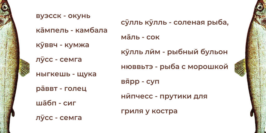 Ловили всё, что попадалось: вуэсск, ныгкешь, ша̄бп, иногда даже лӯсс. Крупную – берегли, выменивали или продавали. А себе оставляли ту, что жирнее и свежее, её сразу в котёл. Варили уху: без лаврового листа, без специй, только вода, рыба и чуть соли. Пока одна партия кипела, вторая уже шипела на нӣпчесс – прутиках у костра. Это была местная рыба-шашлык: медленно, с дымком, но без обугленных углов.