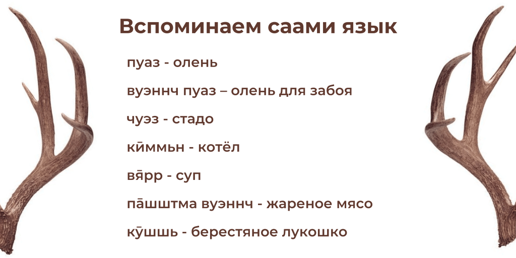 Когда на Кольском полуострове опускалась полярная ночь, рыба постепенно уходила на второй план. Главной пищей становился пуаз(олень) – домашний и дикий (коанньт). Он давал не только мясо, но и всё остальное: шкуру, жир, кость, тепло. В представлении Саами, олень был не просто источником еды, а основой существования, ведь он кормил, поил, возил и одевал.