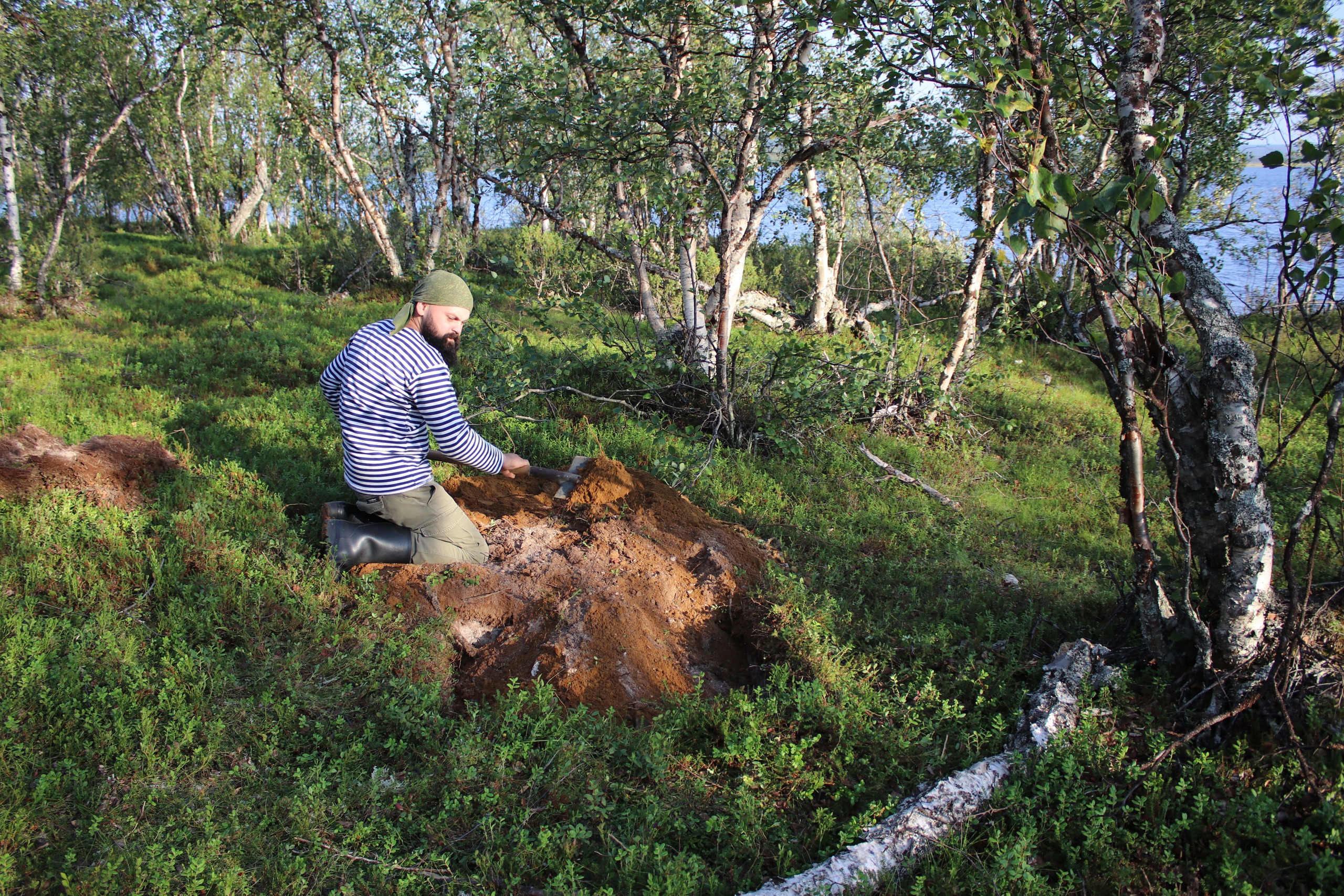 Разбор культурного слоя в разведывательном шурфе. Стоянка Уйма III